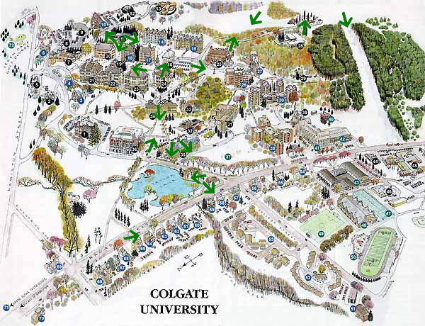 This is an experiment in making an image map that I created in 2001 so my then-girlfriend, who was living in Jordan, could see what Colgate looked like. Click on the green arrows to see images of campus from those angles. You can also view these pictures in convenient table form.